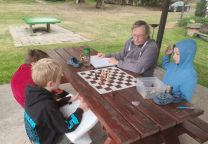 Jinak odpoledne pokračoval turnaj v dobble, ve kterém ve finálové skupině došlo na prvním místě k plichtě mezi dvojčaty Augustýnovými, kteří si tak rozdělili 1. a 2. místo. Na třetím místě se umístil Radek Hanzlík. V družstvech s výrazným náskokem zvítězilo Pepe. Na tento den si Gusta vymyslel soutěž „běhací šachy“, kdy proti sobě hrála jednotlivá družstva, na tahu se střídali jednotliví jejich členové a po tahu běželi cca 10 metrů zmáčknout hodiny soupeři. Podívaná byla napínavá, zrovna tak jako pro jednotlivé účastníky „šachoběhu“, i když je vhodné podotknout, že družstva byla vybírána pro nešachové disciplíny, takže i hráčská vyrovnanost jednotlivých družstev byla velice různá. Ale o to byla atmosféra soutěže krásnější a napínavější, a na jejím výsledku už tolik nezáleželo (účastníkům hóóóódně moc 😊).